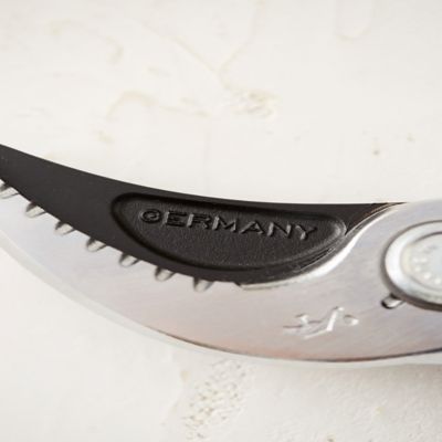 - Chrome plated forged steel blade, forged aluminum handles, rubberized grips