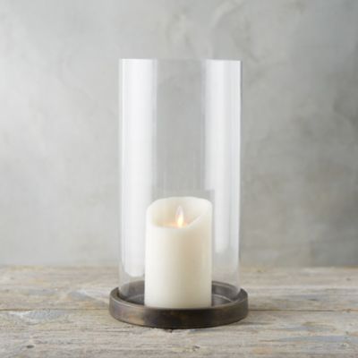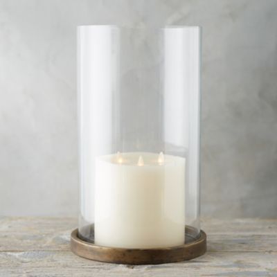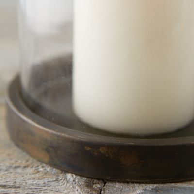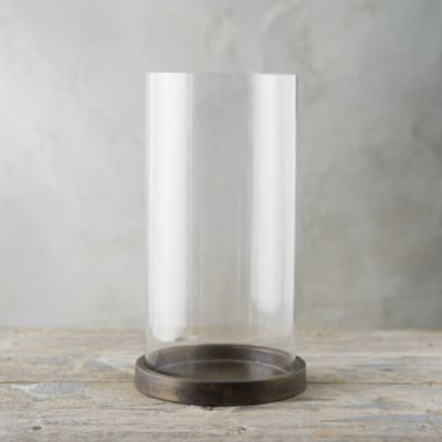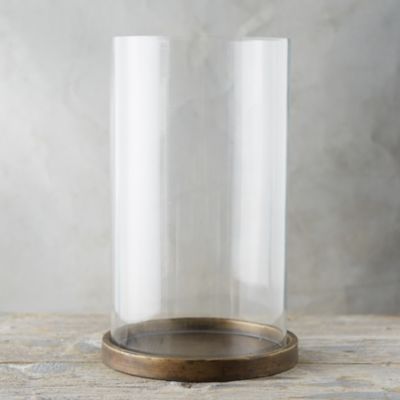 An iron disc with a brass finish serves as the base for this sleek hurricane.