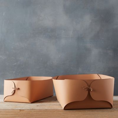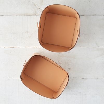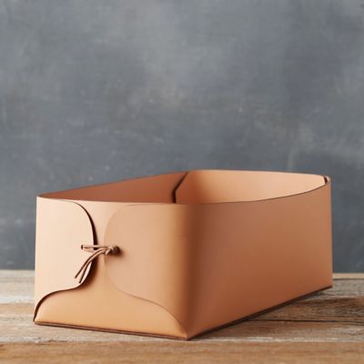 Handmade from chic leather, this spacious basket offers a modern storage solution for blankets, books, toys, and more.