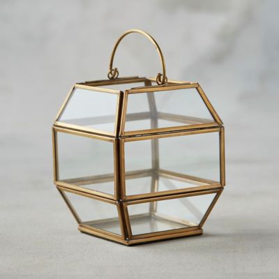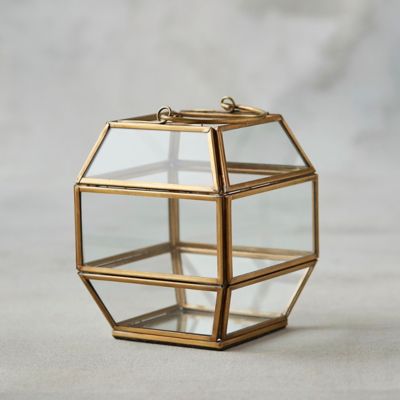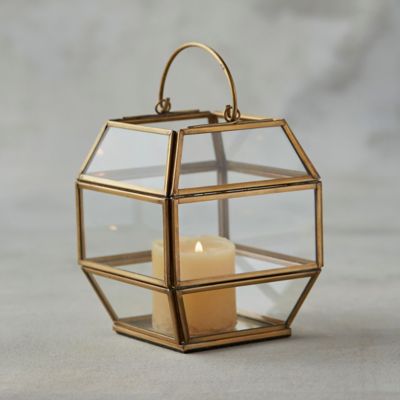 Framed in brass, this petite lantern features a mirrored base to reflect the glow of a single tea light.