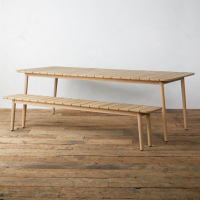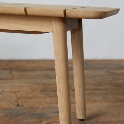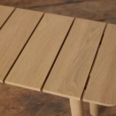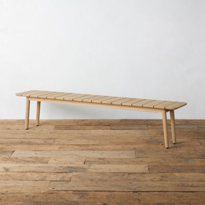 Built from teak in a blonde wash, this dining bench is finished with a slatted top for added durability and visual interest. Organic detailing and a natural silhouette define the Grove collection's clean design and bohemian sensibility.