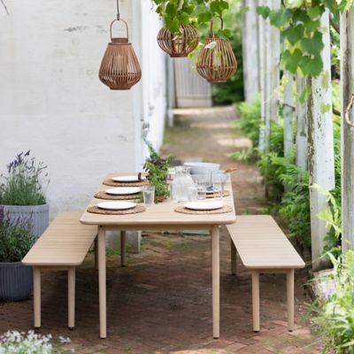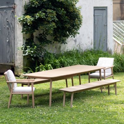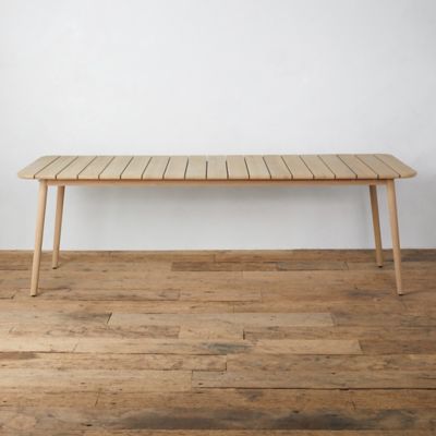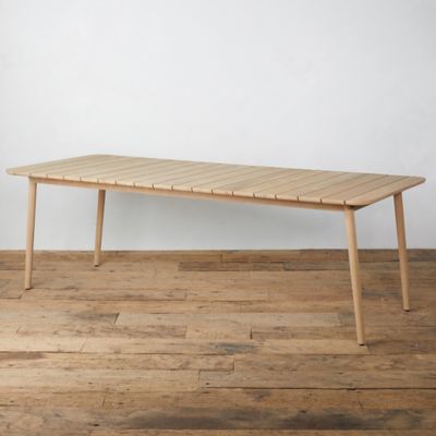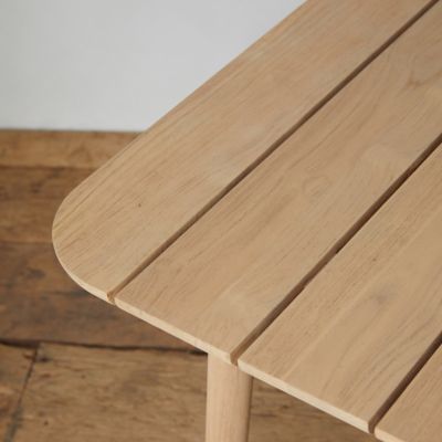Built from teak in a blonde wash, this dining table is finished with a slatted top for added durability and visual interest. Organic detailing and a natural silhouette define the Grove collection's clean design and bohemian sensibility.
