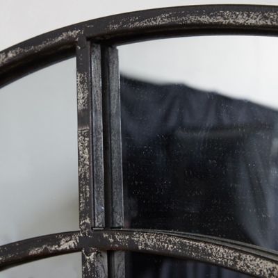 Framed in sleek iron, this half-moon mirror makes a modern adornment for indoor spaces.