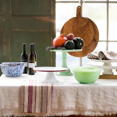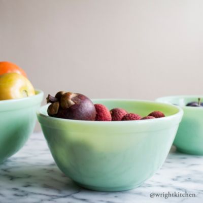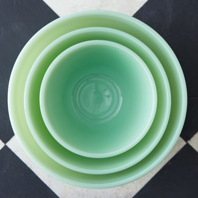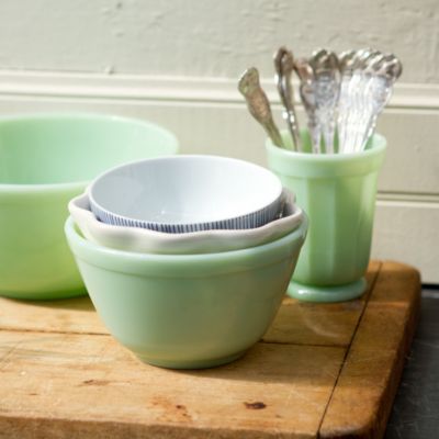 In the 1940s and 50s jadeite– a colorful, opaque glassware– was commonly sold in hardware stores and five-and-tens. Today, this chipper mixing set lends a vintage vibe to baking and dinner prep.