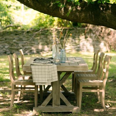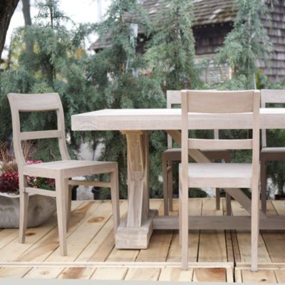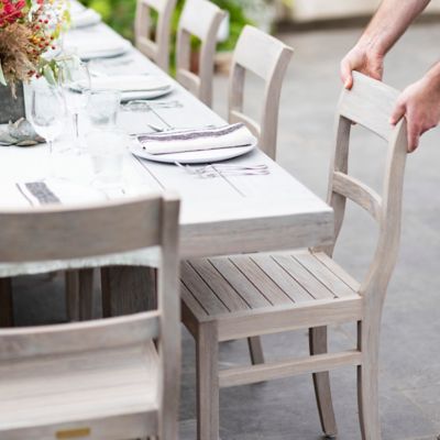 Weighty construction brings comfort to this teak dining chair, whose true appeal lies in its resilience to water and dirt. Treated with our Teak Shield finish, living cells in this wood frame are closed off to stains associated with use, so that water, wine, and even oil can be wiped away easily without marks to the surface.