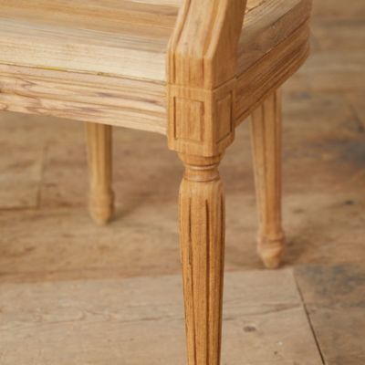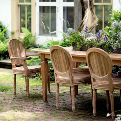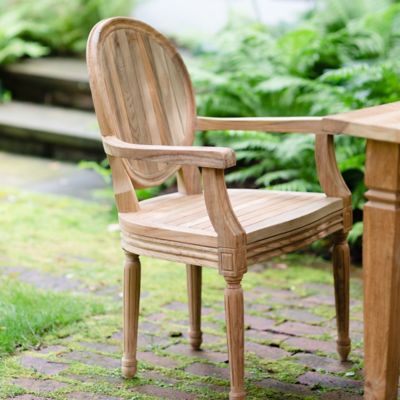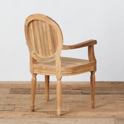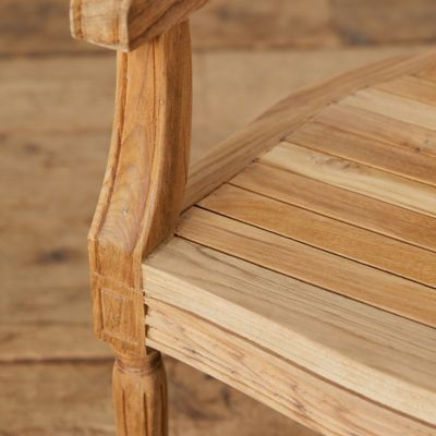 This teak armchair reflects the elegant gardens of bygone eras with a French influence.