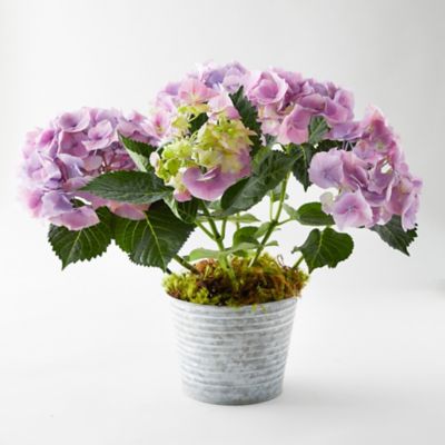 - Hydrangea, soil, moss, metal pot, plastic liner