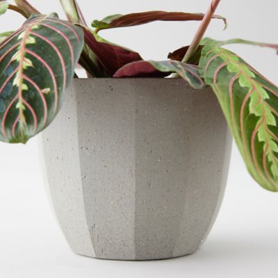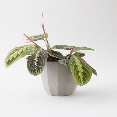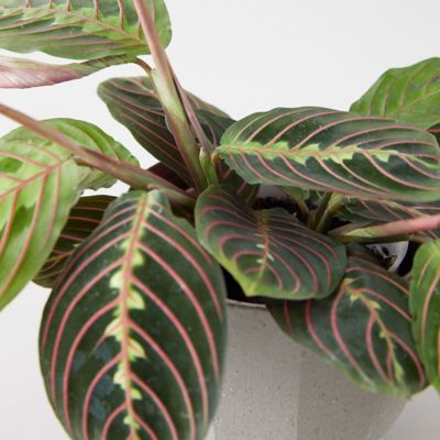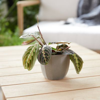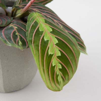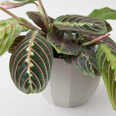 Give the gift of this beautifully colored prayer plant, ready for display in a gray ceramic pot.