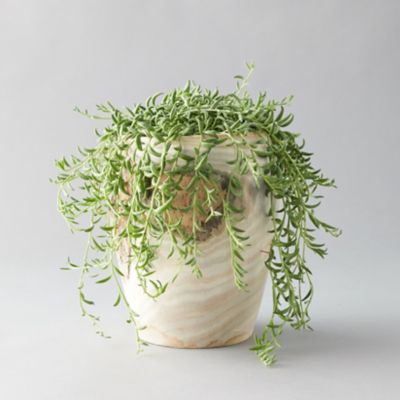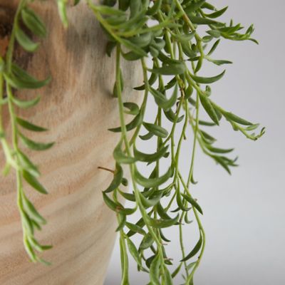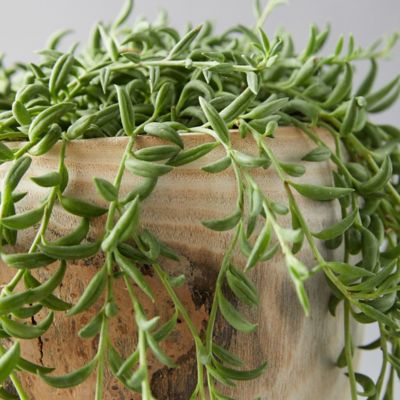 A wood pot offers a classic display for a string of pearls bananas plant, perfect for gifting.